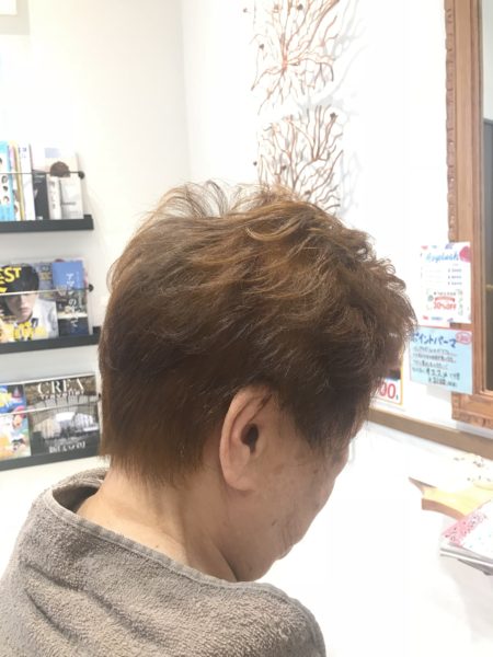上の写真の女性は(90歳のお客様です♪)パーマもひんぱんにかけ、髪も細くなってきているので、傷まないようにマニキュアを選択させて頂きました。