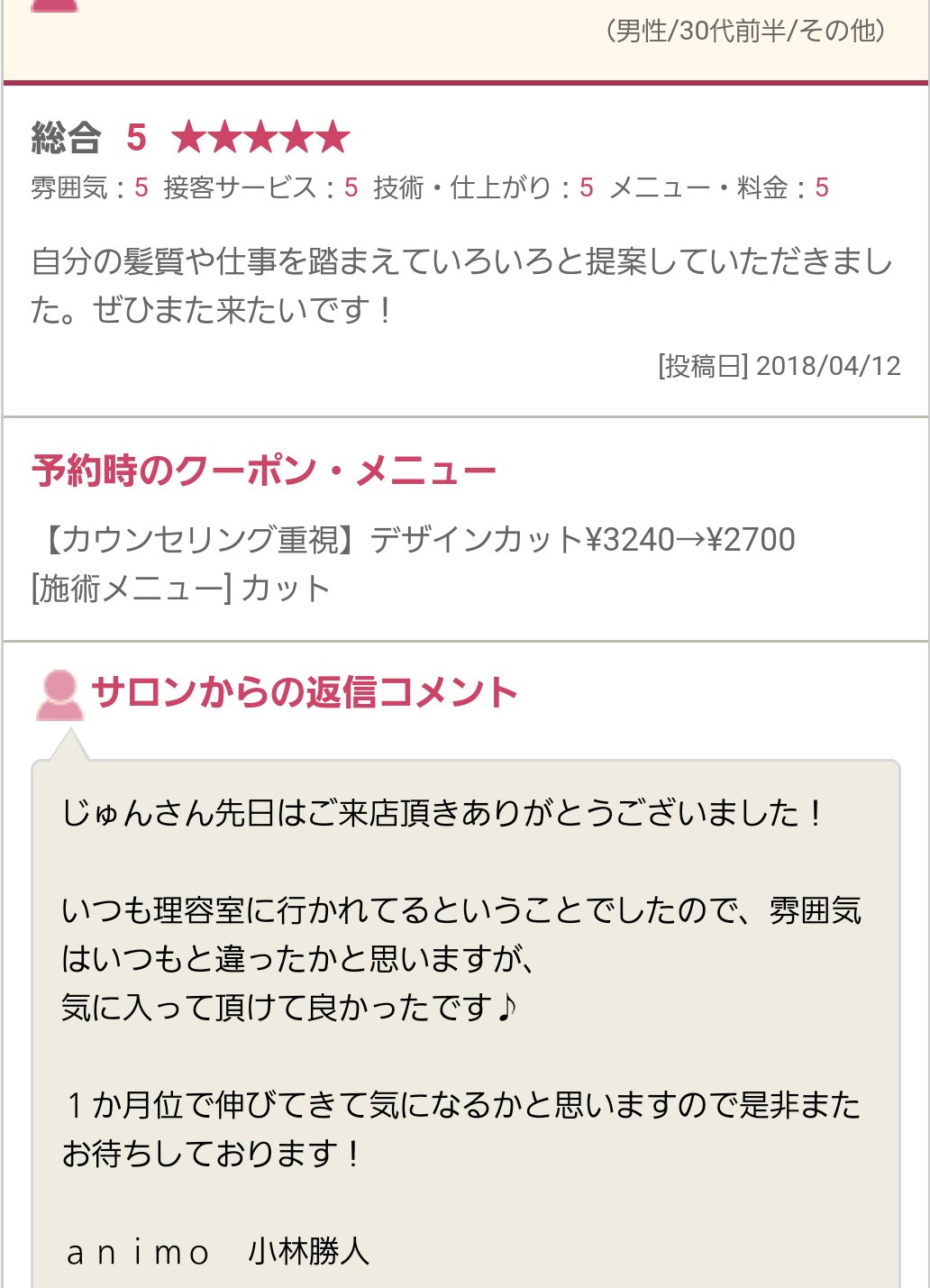 ホットペッパーでもありがたい口コミ頂きました♪