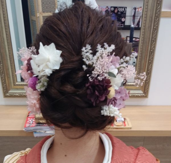成人式の前撮りにセットしたヘアですが、飾りを少なめにしたり、違う飾りをつければパーティーヘアにも大丈夫です。