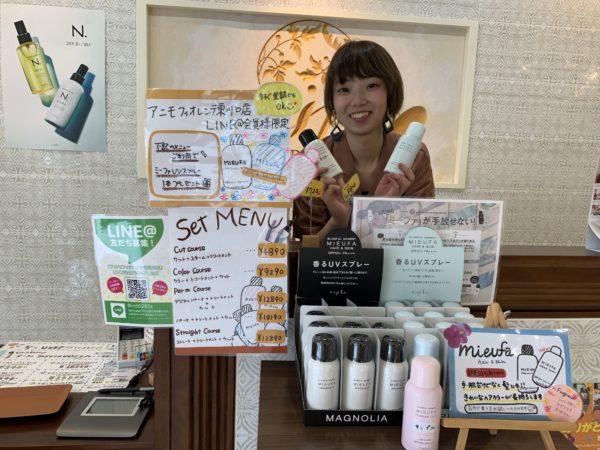 今LINE@を登録していただきセットメニューを選んでいただくともれなくミーファをプレゼントしております! ミーファは紫外線から髪の毛とお肌を守ります! 香りも3種類あるので香水がわりにもなります! ぜひLINE@をご登録ください!