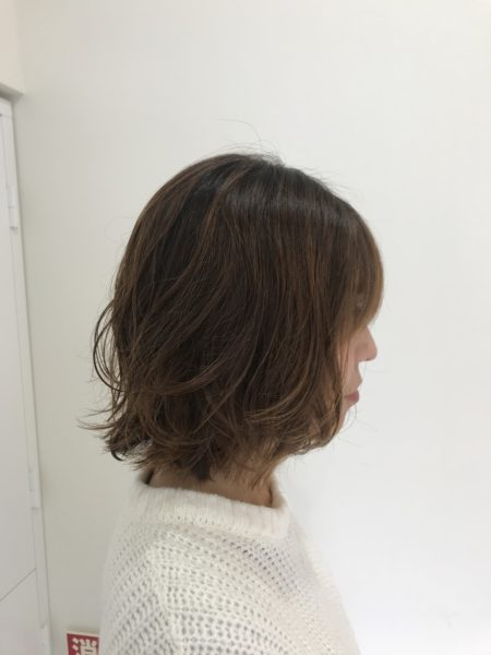 肩上のボブにカットし、表面にレイヤーを入れて動きを出しています!毛先から中間をMIXに巻いています!スタイリング剤はN.ポリッシュオイルで束感わ出しています!