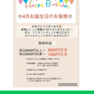 いつもアニモフィオレンテ東川口店をこ゛利用頂きありか゛とうこ゛さ゛います!アシスタントの鈴木です 4月お誕生日のお客様?LINE@のバースデークーポン?LINE・・・