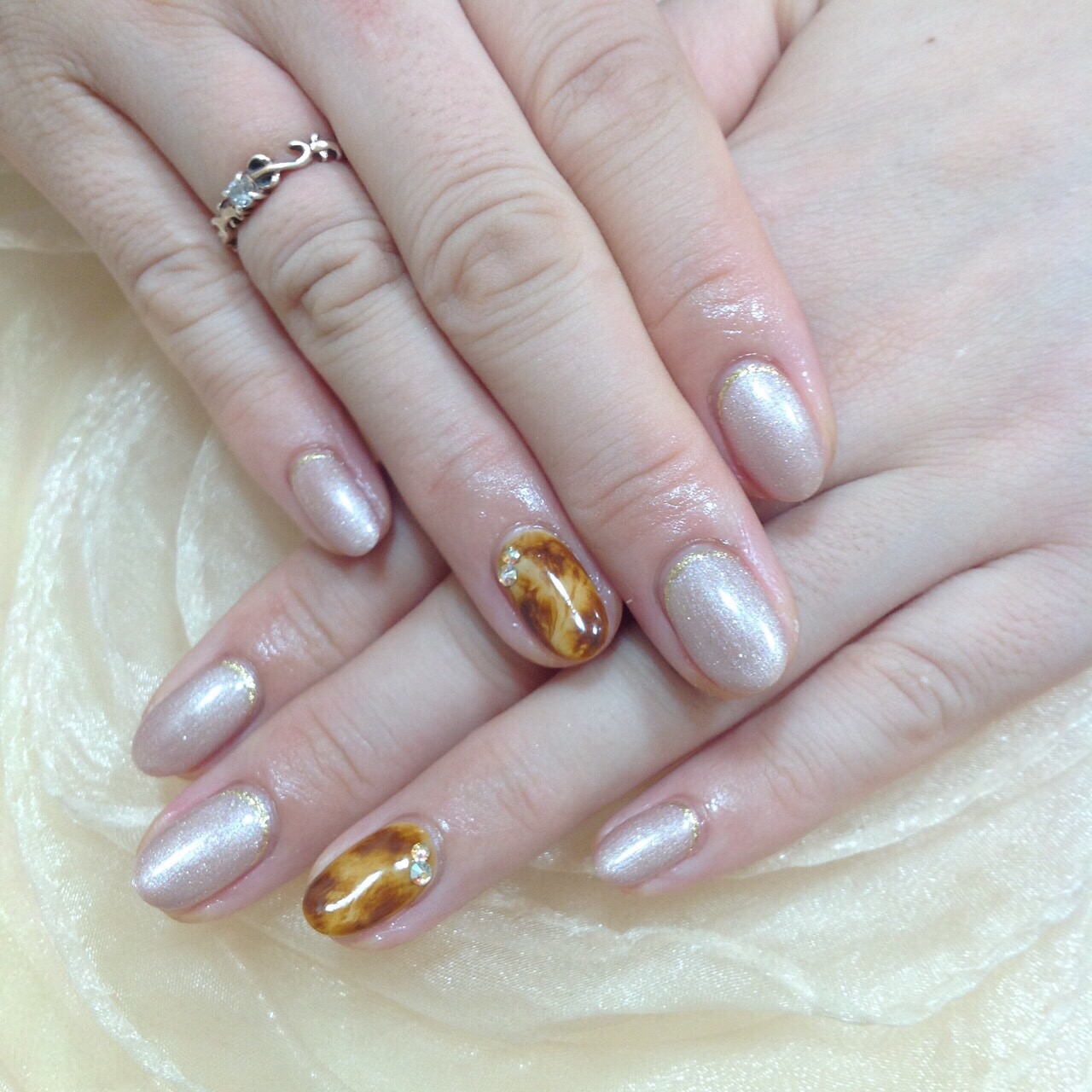 べっ甲ネイルまだまだ人気です♪ こちら定額3800円のデザインに プラスアートでべっ甲を1本ずつ入れたものです♡