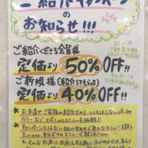 本日はご紹介してくださった方の特典をご紹介致します ❗️ 御新規様をご紹介下さった方は50%offで施術させていただきます❗️❗️ またご紹介された方は全メニュー定価から40%offで施術させていただきます❗️❗️