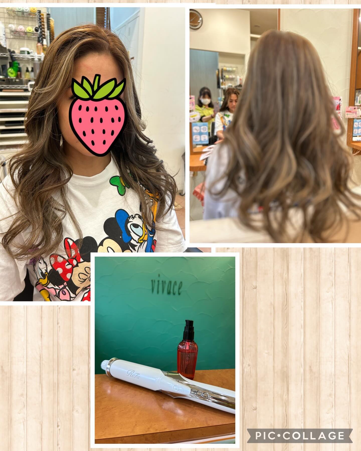 ハイライトが入って、色抜けしているのと根元の色が出てきているので、全体にカラーをして、リファのロックオイルをつけてリファのカールアイロンで巻いて仕上げさせていただき、素敵になりました。大島