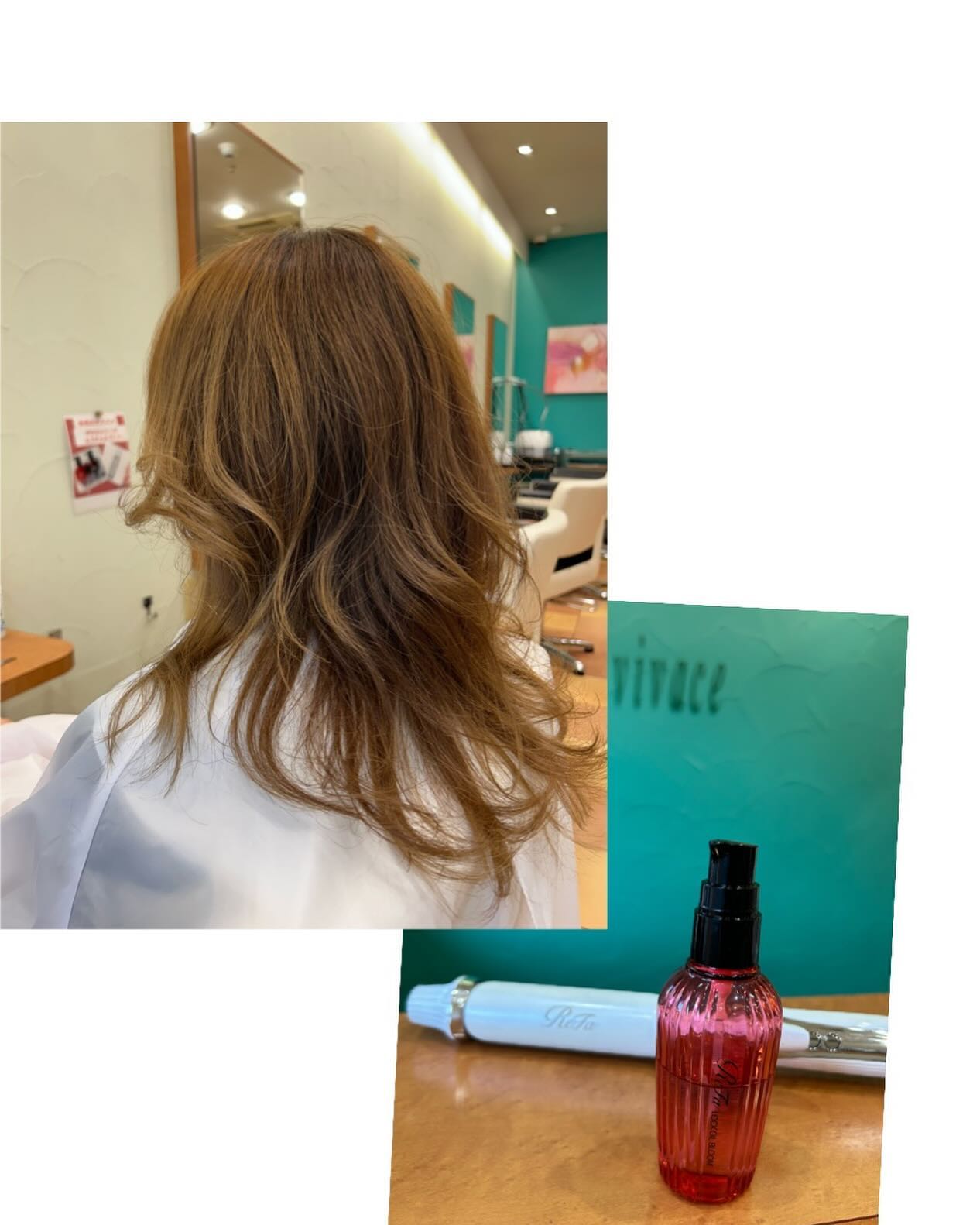 パーマが取れてきたので、仕上げは、リファのロックオイルを付けて、リファのカールアイロンで、巻いて、動きをでしました。大島
