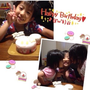 息子リクエストの初アイスケーキに妹達からのチュウ😚をされて、嬉しいそうでした😎