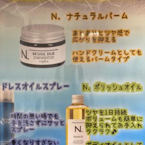 乾燥が気になる髪が静電気をおびてまとまらない なんて悩みは保湿してみませんか? オススメのオイル使ってみませんか? N. ナチュラルバームN. ポリッシュオイル・・・