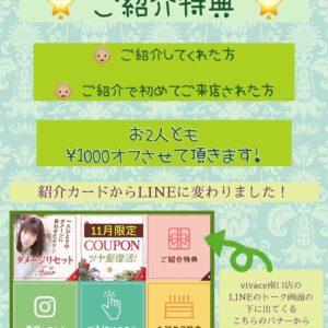 ご紹介特典がリニューアルしました! ご紹介してくれた方も、ご紹介で初めてご来店された方も1000オフ! 紹介カードがなくなり、vivace南口店のLINEのトー・・・