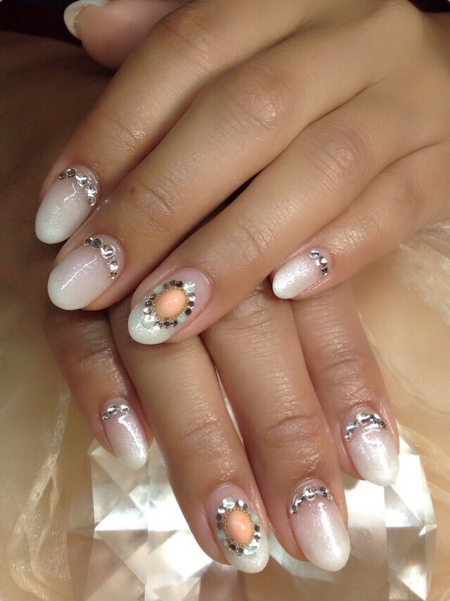 ストーンがたっぷり入ったゴージャスネイルです( ´ ▽ ` )ノ 白のカラーグラデーションは、入学式や結婚式など特別な日にぴったりです♪
