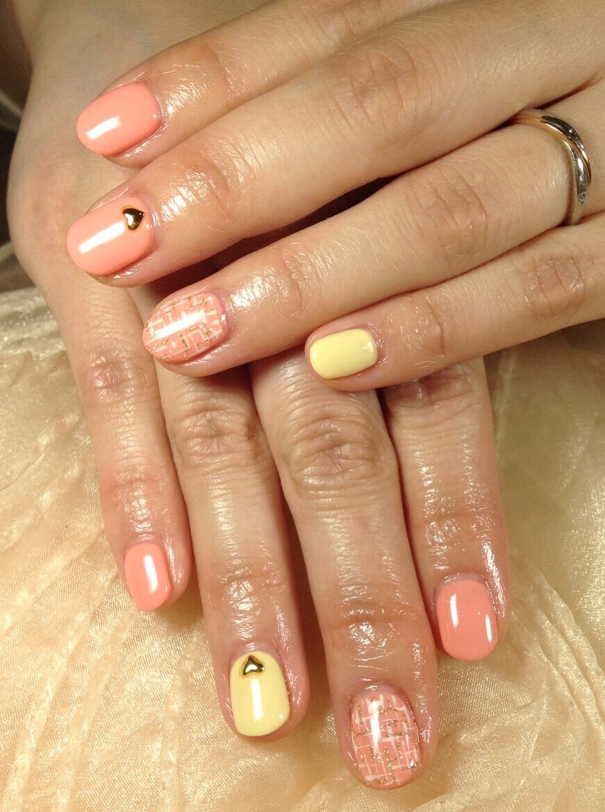定額3800円のデザインです! イエロー×ピンクの組み合わせも相性がいいですねo(^▽^)o 差し色をラメに変えるとエレガントな印象にガラリと変わりますよ♪(´ε` )