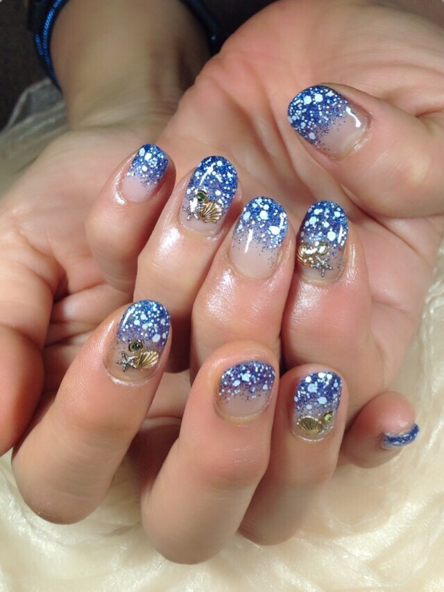 梅雨来る前に夏!夏!夏ネイルです(*^^*) ラメグラの上からホロを散らしました( ´ ▽ ` )ノ まさに水面のようで、海外のキレイな海のようなネイルになりました(^з^)-☆