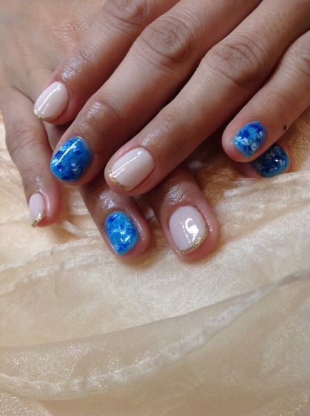 ブルーのマーブルアートに 細いラメフレンチが素敵ですね!!