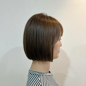 こんばんは! アニモフィオレンテ三郷店です 本日のお客様は肩くらいの長さからバッサリパツッとラインのミニボブにスタイルチェンジされました◎ オリーブカラーとの相・・・