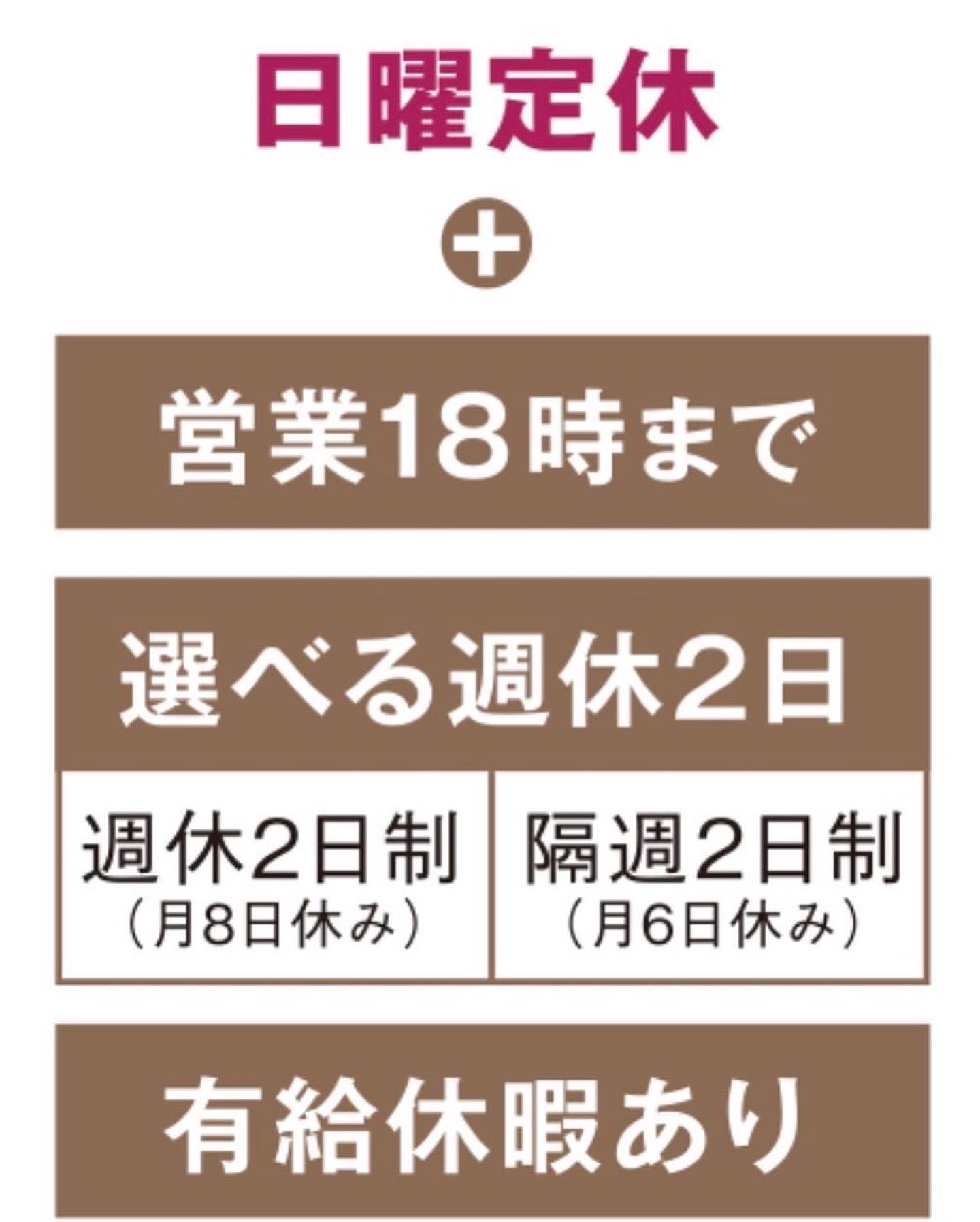 スタッフが安心して働ける環境づくり・一般企業並みの給与水準等に長年取り組み、美容業界にありがちな不安をなくしました。安心して美容に取り組める環境です。日曜定休、18時まで営業、社保完備、産休育休完備、選べる週休二日、住宅手当等、雇用環境は万全!お昼休みはお店を閉めて休憩がとれます