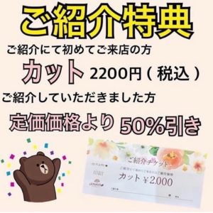 ★ご紹介キャンペーン★最近こしてきて美容室がさだまっていない。なんだか、気分を変えたい。そんなご友人様やご家族の方いらっしゃいませんか?私どもが心よりのオモテナ・・・